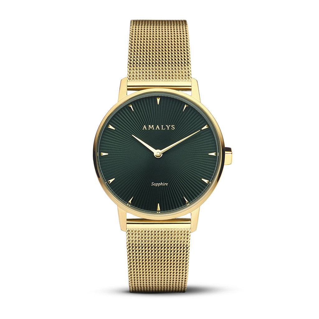 The Amalys 'Odette' AMW-173 combines refined minimalism with contemporary elegance. Its striking emerald green dial commands attention while maintaining understated sophistication, complemented by clean stick indices that enhance legibility. The gold-plated mesh strap delivers a luxurious feel with practical versatility—equally at home in professional or casual settings. Powered by reliable Seiko movement, this timepiece balances aesthetic refinement with dependable performance. A distinctive accessory for those who appreciate modern design with timeless appeal.