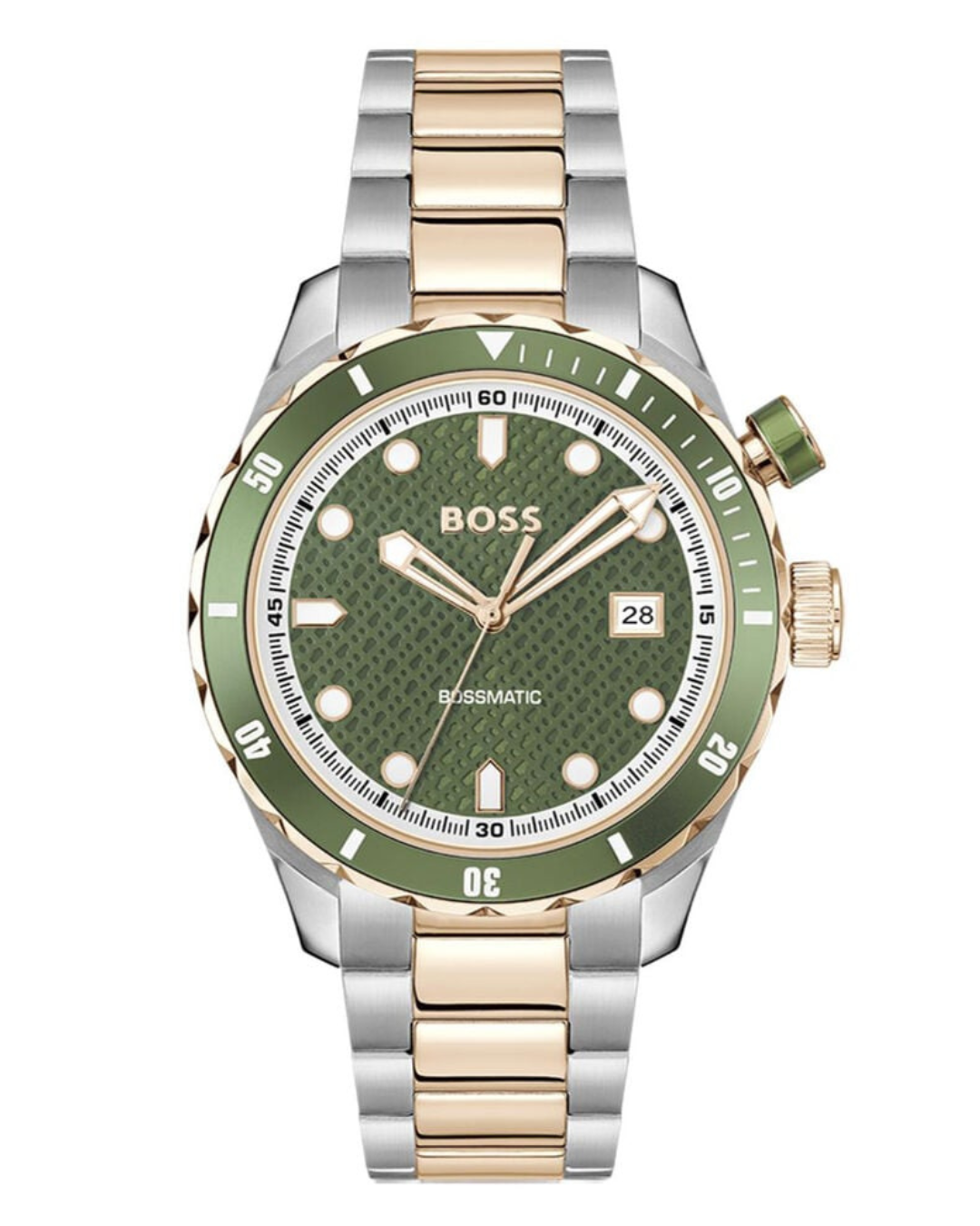 A precision-crafted BOSS Menswear watch powered by a hybrid automatic movement. Bold monogram-textured dial. Lightweight aluminium inlay on the rotating bezel.