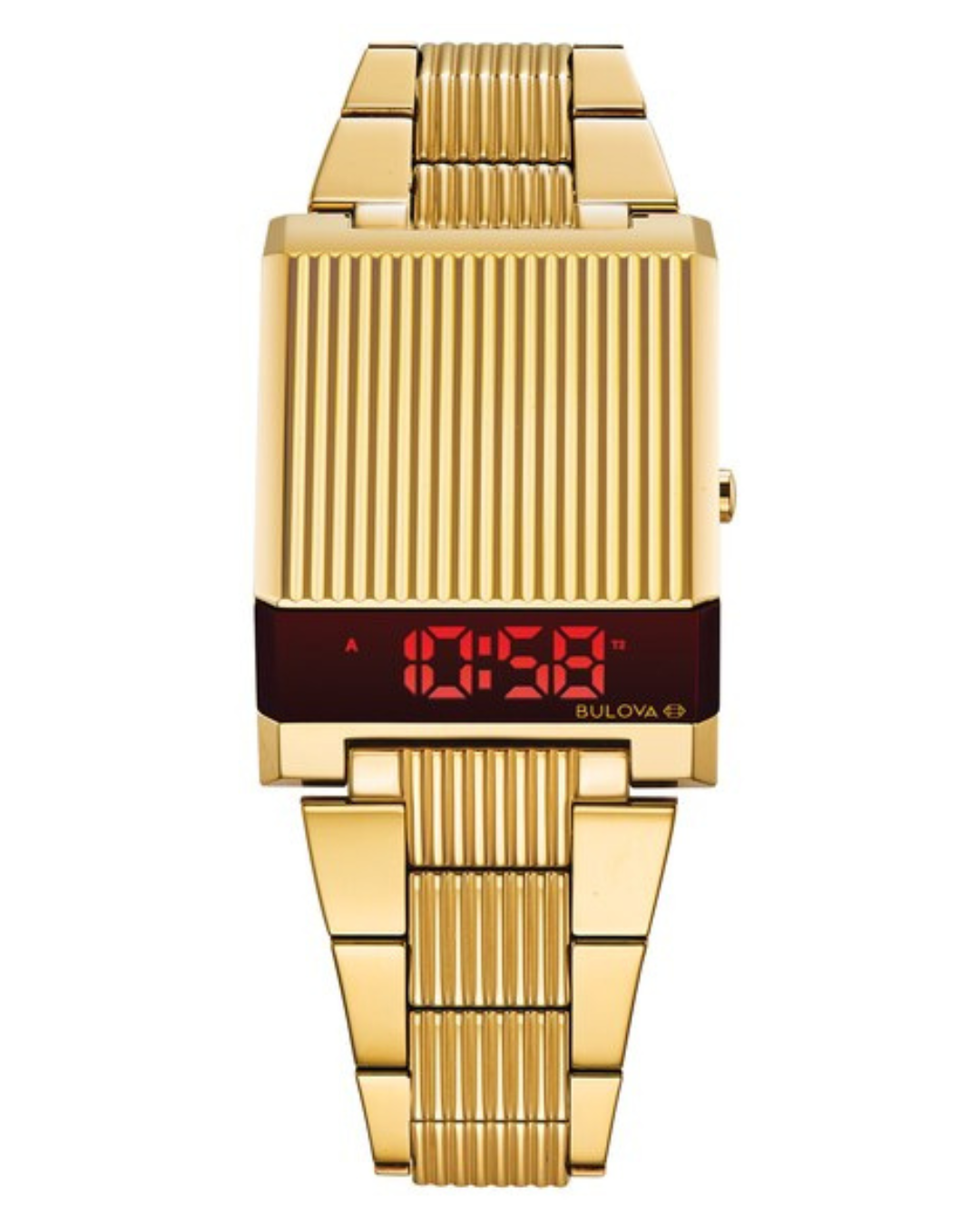 Infusing some of Bulova’s most iconic and nostalgic timepieces with modern elements, the Archive Series continues with the digital LED Computron. The sleek gold-tone stainless steel design features a red LED display, expanded digital functionality now with dual time zone capabilities and a distinct retro design that is as relevant today as it was in the 1970’s. Water resistance to 30 metres.