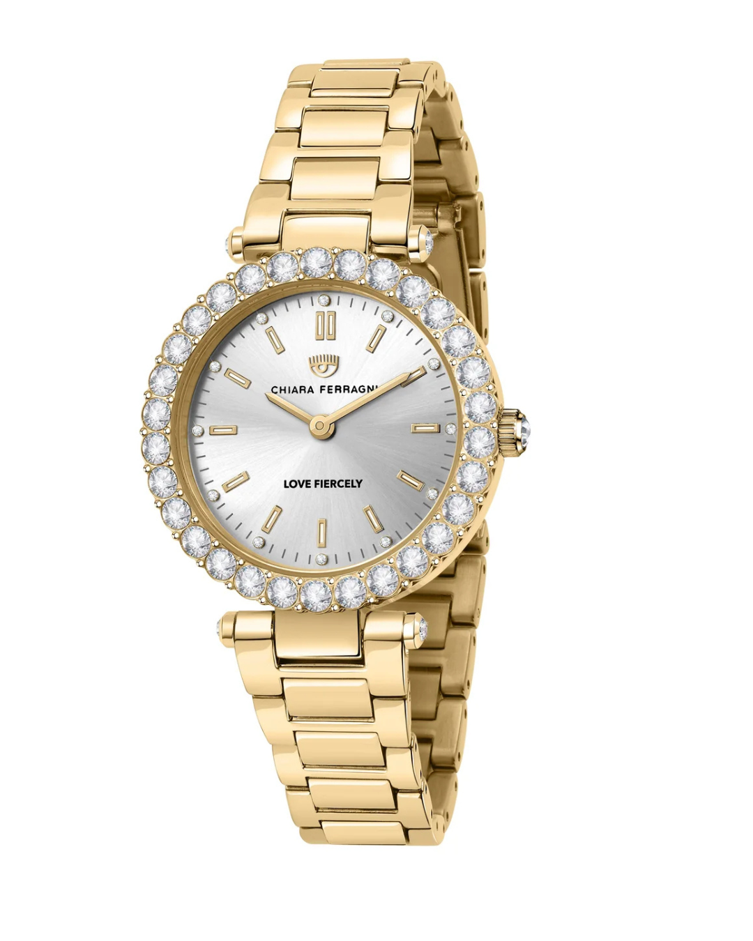 Elevate your timepiece collection with this sophisticated Chiara Ferragni watch. The luxurious gold-plated stainless steel link bracelet offers durability with refined elegance, while the bezel adorned with precision-set cubic zirconia creates a captivating play of light. This meticulously crafted accessory seamlessly transitions from professional settings to evening occasions, combining precision timekeeping with designer aesthetics.