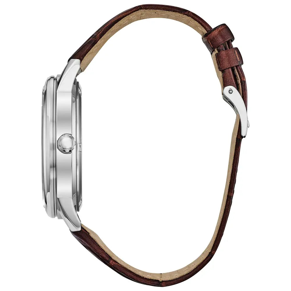 A combination of functional simplicity with a touch of timeless elegance, this Men's Sport is powered by any light with Eco-Drive technology. This model features a stainless steel case and chocolate brown leather strap with midnight blue dial, day/date display and 12/24-hour time.