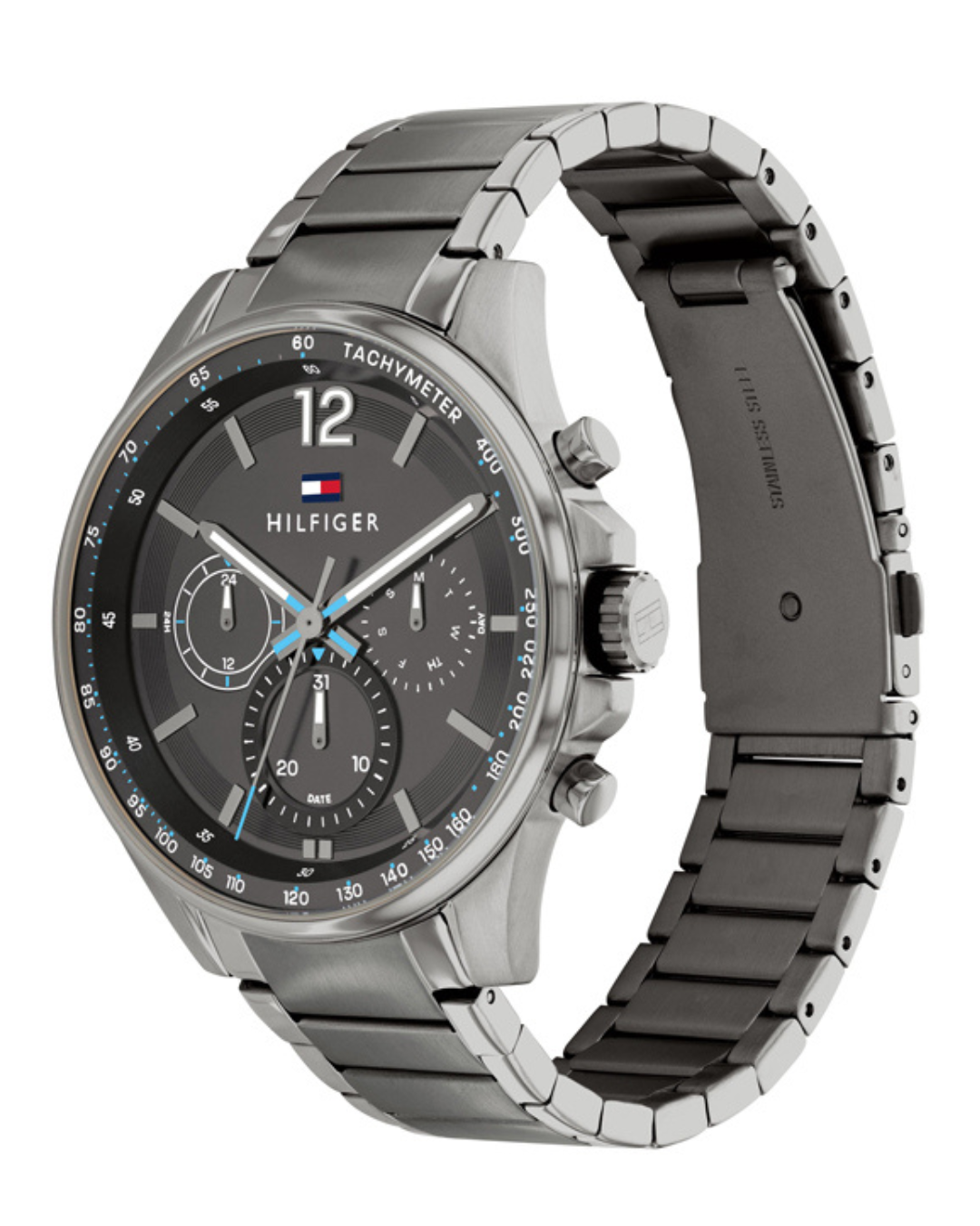The Tommy Hilfiger 1791975 watch features a sleek gunmetal grey stainless steel design with a functional chronograph. Combining modern style with functionality, this watch is a trendy choice for any occasion.